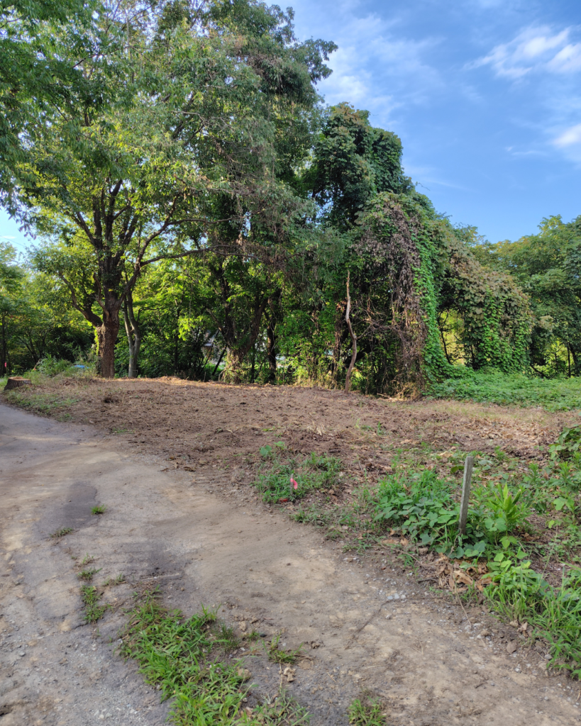 まずは伐採作業からスタートし、作業エリアを明確にするため、