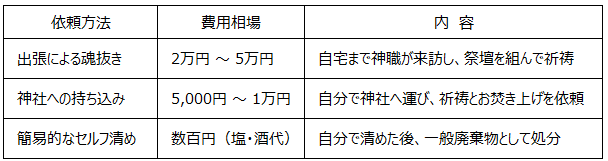魂抜きを行う場合の費用は、神職を招く出張祭祀で 2万円〜5万円程度、