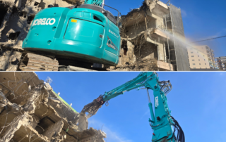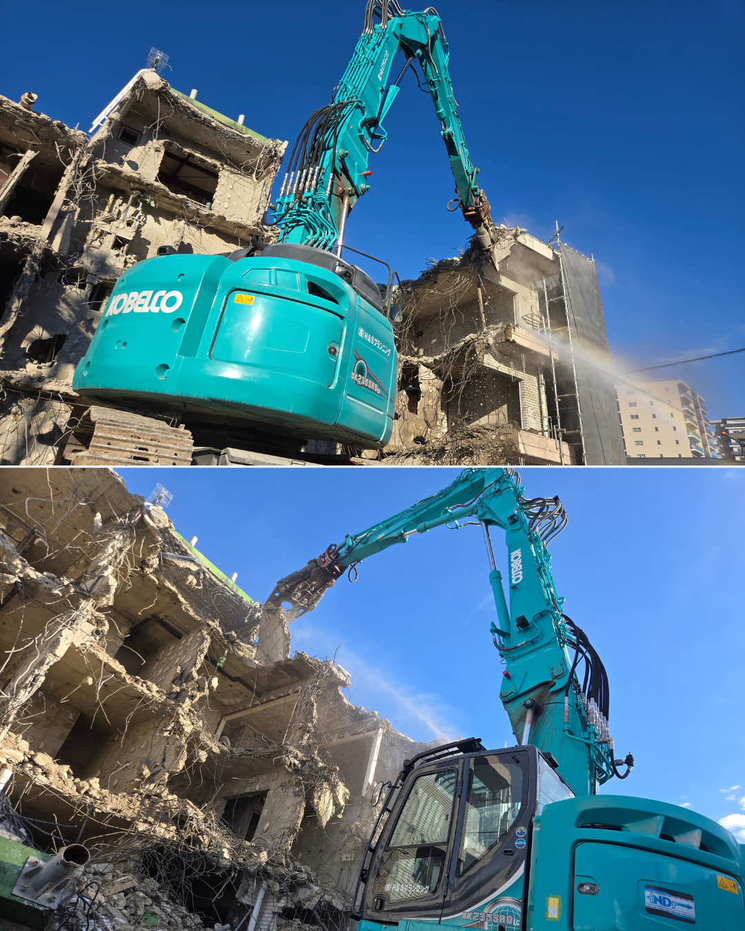 RC造は特に粉塵の飛散が多いため、しっかり散水を行いながら解体していきます。