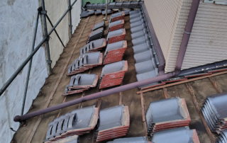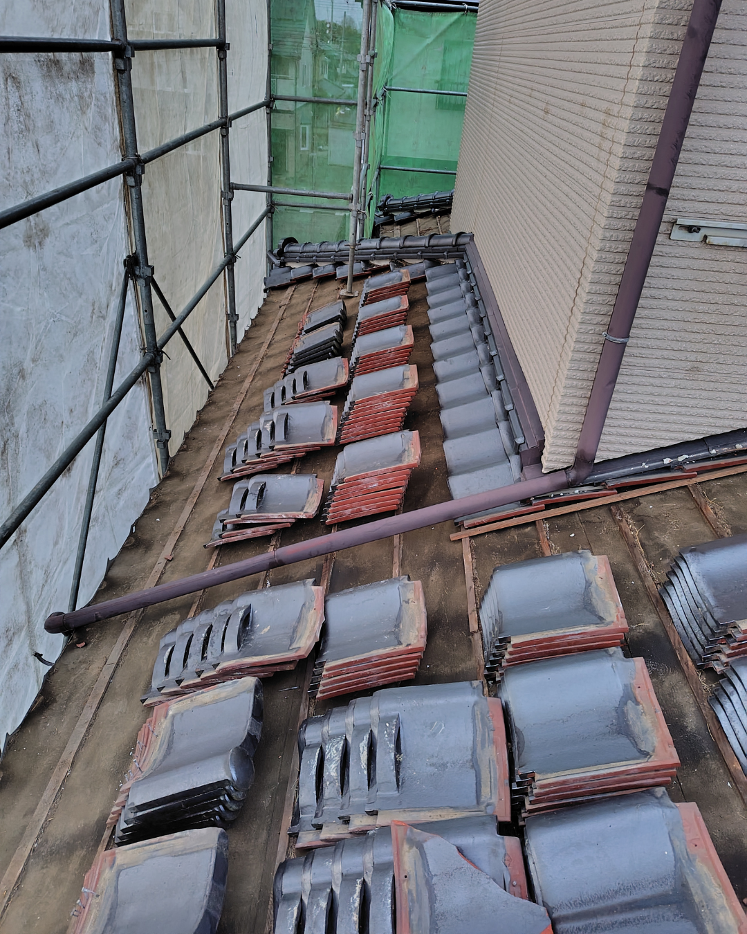 熟練のスタッフが瓦を一枚ずつ手作業で下ろしていきます。 「丁寧な解体は屋根から!」 現場の整理整頓を徹底し、安全第一で作業を進行しています。